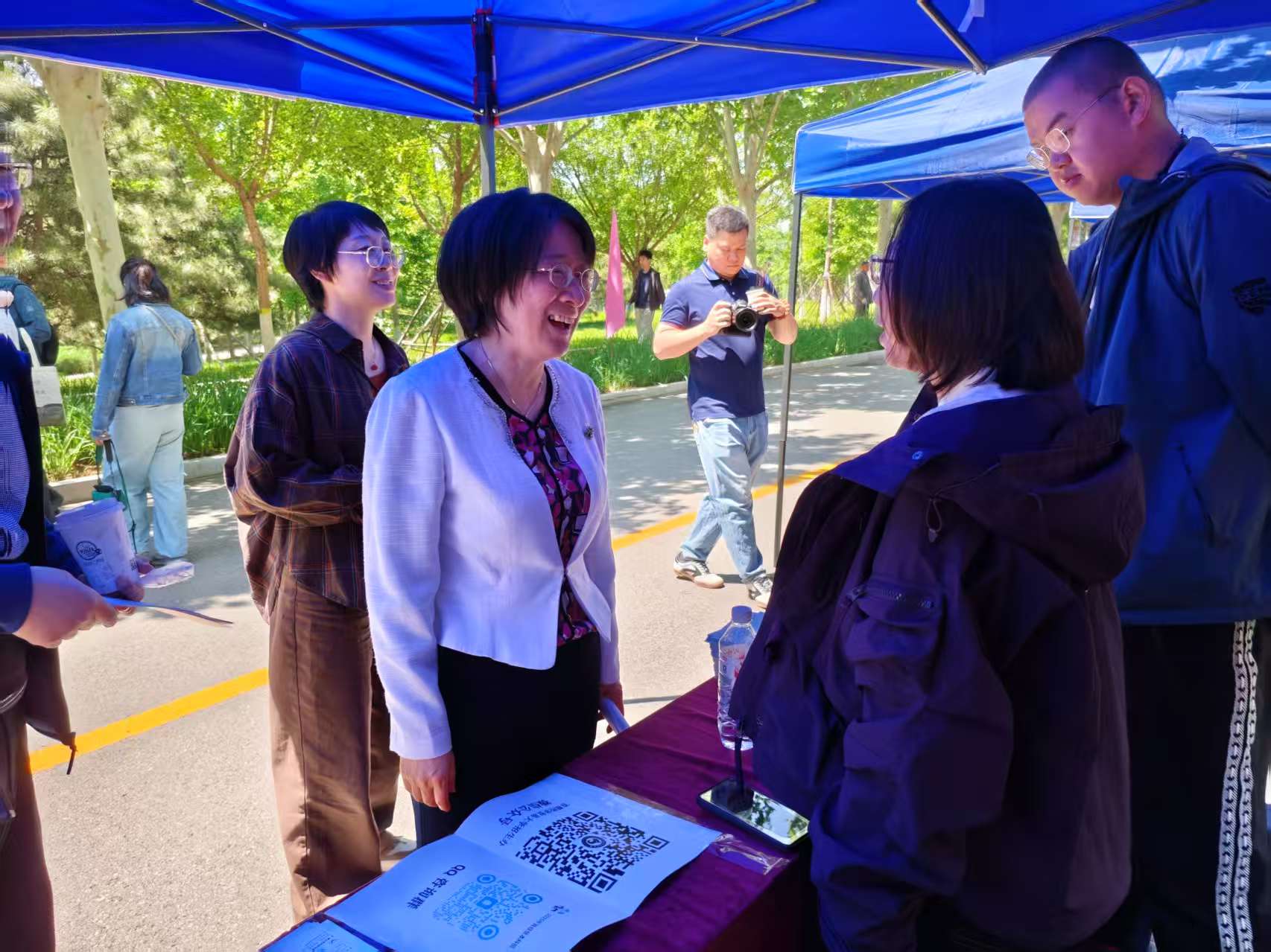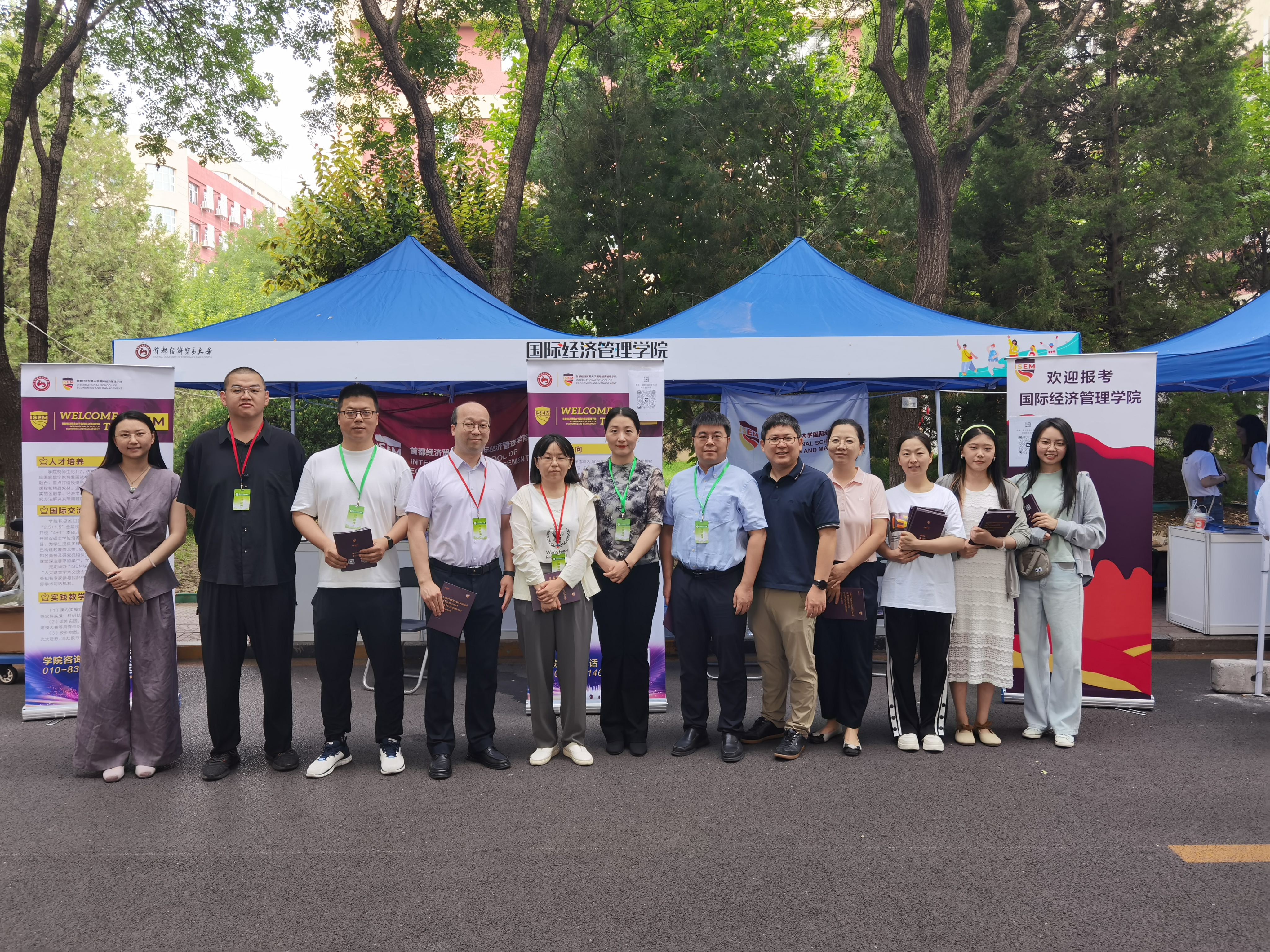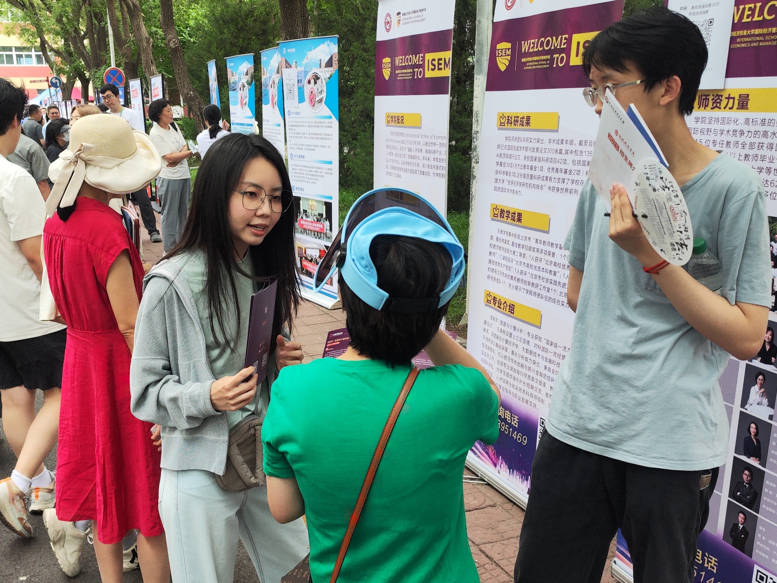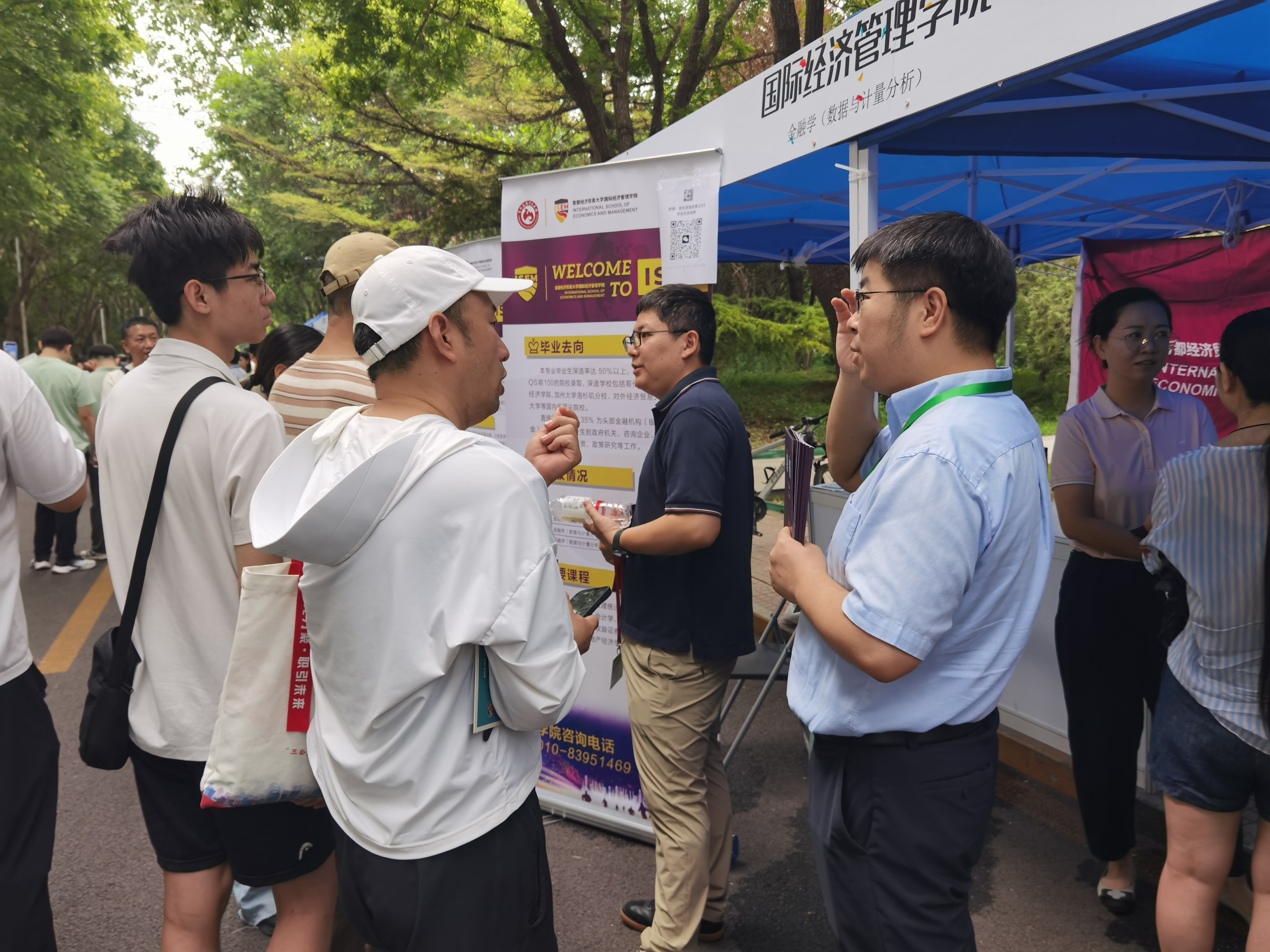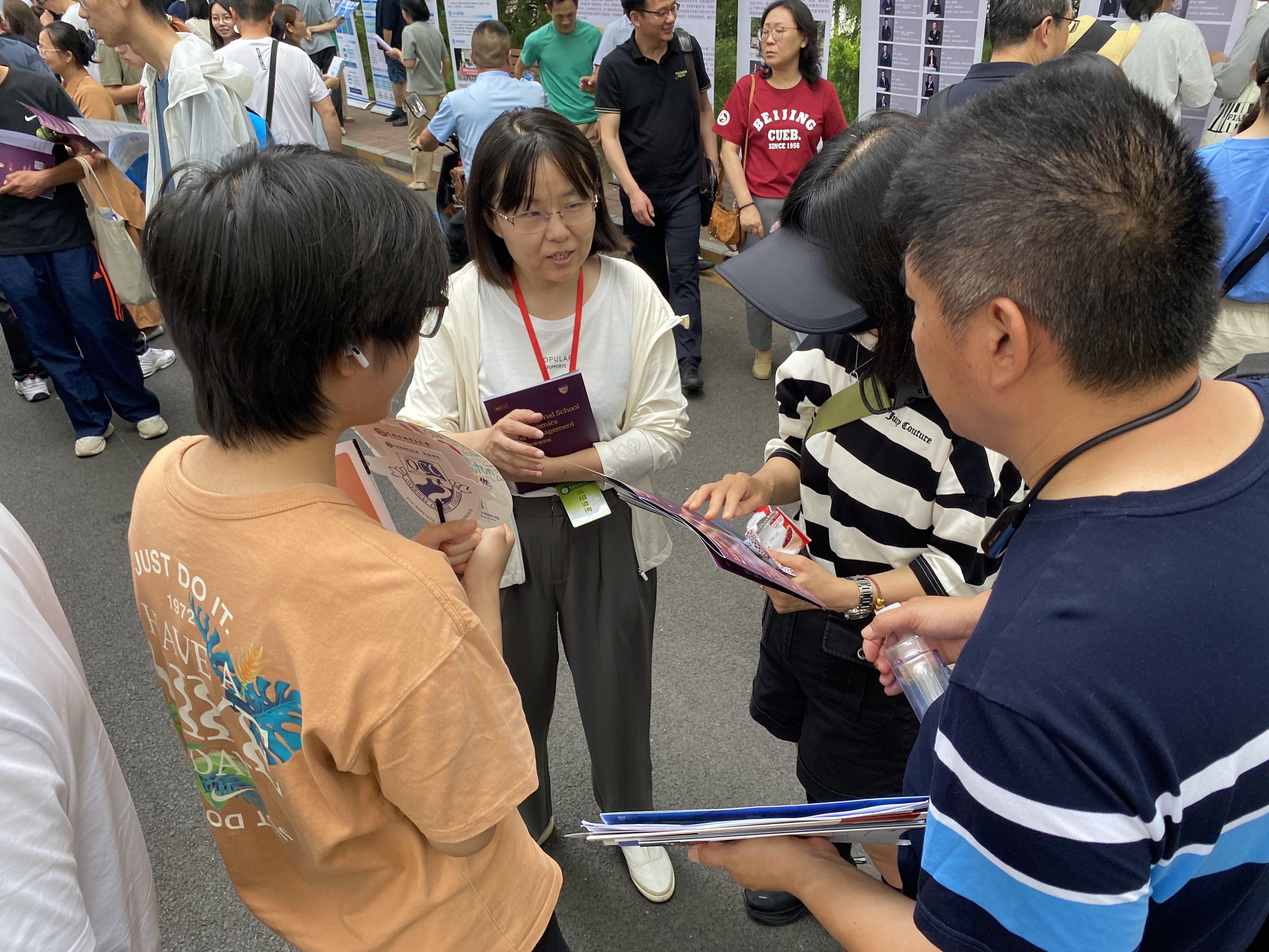 6月26日上午,黄瓜视频 在黄瓜视频 校园开放日活动中,面向2025届高考考生及家长开展了本科招生现场咨询。学院党委书记姜蓓蓓、院长马庆寅、党委副书记付明岩、副院长高静、副院长李委明、金融系两位主任黄宗晔和庞蔡吉、团委书记张雅淇、教学秘书胡一晗以及在校学生代表共同参与了此次活动。