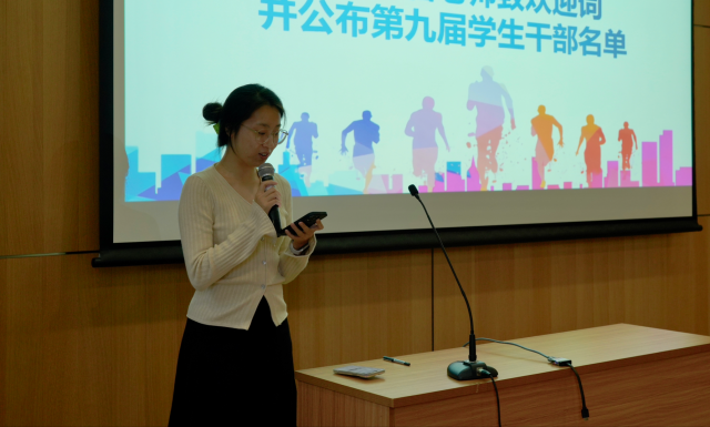 白敏煊老师致欢迎词并公布第九届学生干部名单。白敏煊老师首先对新任学生干部表示了祝贺,同时希望学生干部们能够积极发挥思想引领作用,在打造品牌活动、维护学生权利和校园文化建设方面继续努力。