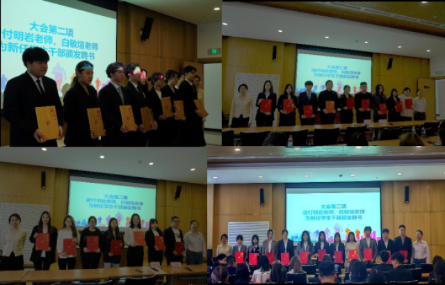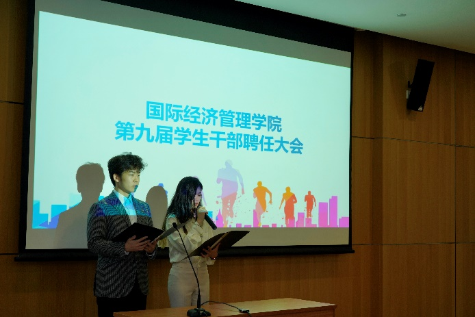 随后,付明岩老师和白敏煊老师为新任学生干部颁发聘书。学生干部代表分团委副书记刘听雨、研究生会主席吴赟龙、学生会主席郝陈祎先后上台发言,他们表示在任期内会做好师生间沟通的桥梁和纽带,在工作中会始终保持脚踏实地、沉稳进取、认真负责的工作态度,肩负起学生组织的使命和责任,努力做一届令人铭记的学生干部。