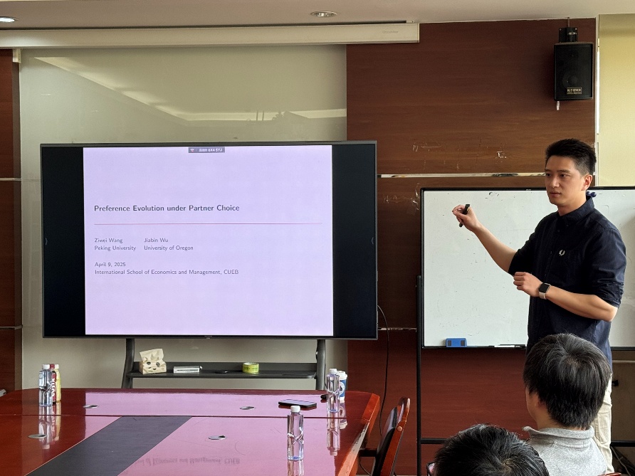 4月9日,王子伟老师为黄瓜视频 师生作了题为《配对选择中的偏好进化》(《Preference Evolution under Partner Choice》)的学术报告。报告研究了内生匹配下的偏好演化:短期中个体主观偏好影响社交互动中的伴侣选择与行为,进而决定物质收益并驱动长期偏好进化。分析表明,内生匹配会进化出兼具亲缘偏见与高效合作能力的稳定偏好,这些偏好通过促成同类匹配与联合收益最大化占据优势;而在信息不完全时,狭隘主义等强亲缘偏见能通过强化自我分类动机成为演化稳定的关键。