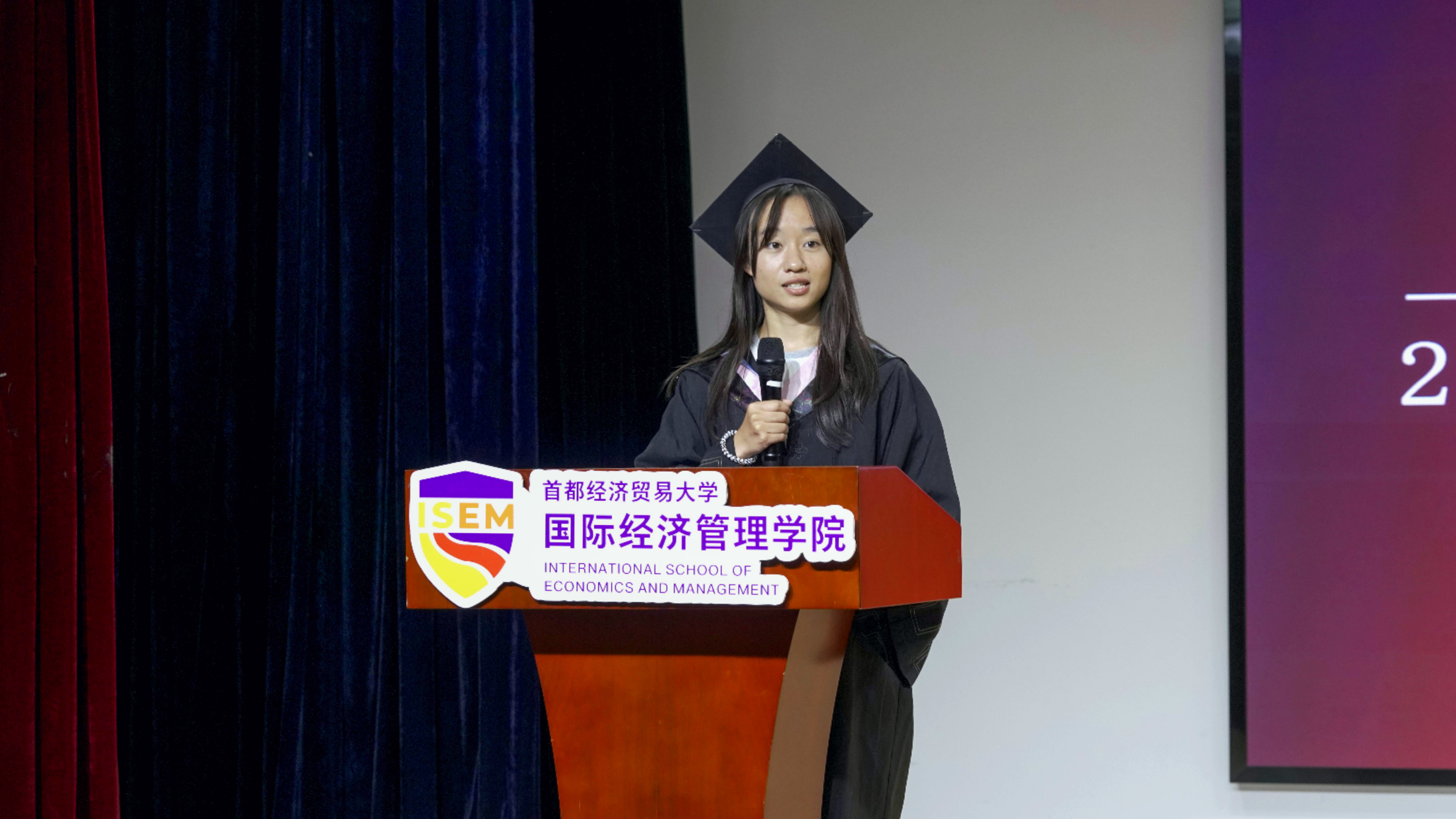 本科毕业生郭媛、研究生毕业生贾若琦作为优秀毕业生代表发言。她们表达了对母校和学院真挚的感谢和深情的祝福。她们共同回顾了丰富多彩的校园生活,并期待全体毕业生带着学校和学院赋予的智慧、视野和力量,奔赴不同的领域持续绽放光芒,不负学院期待。