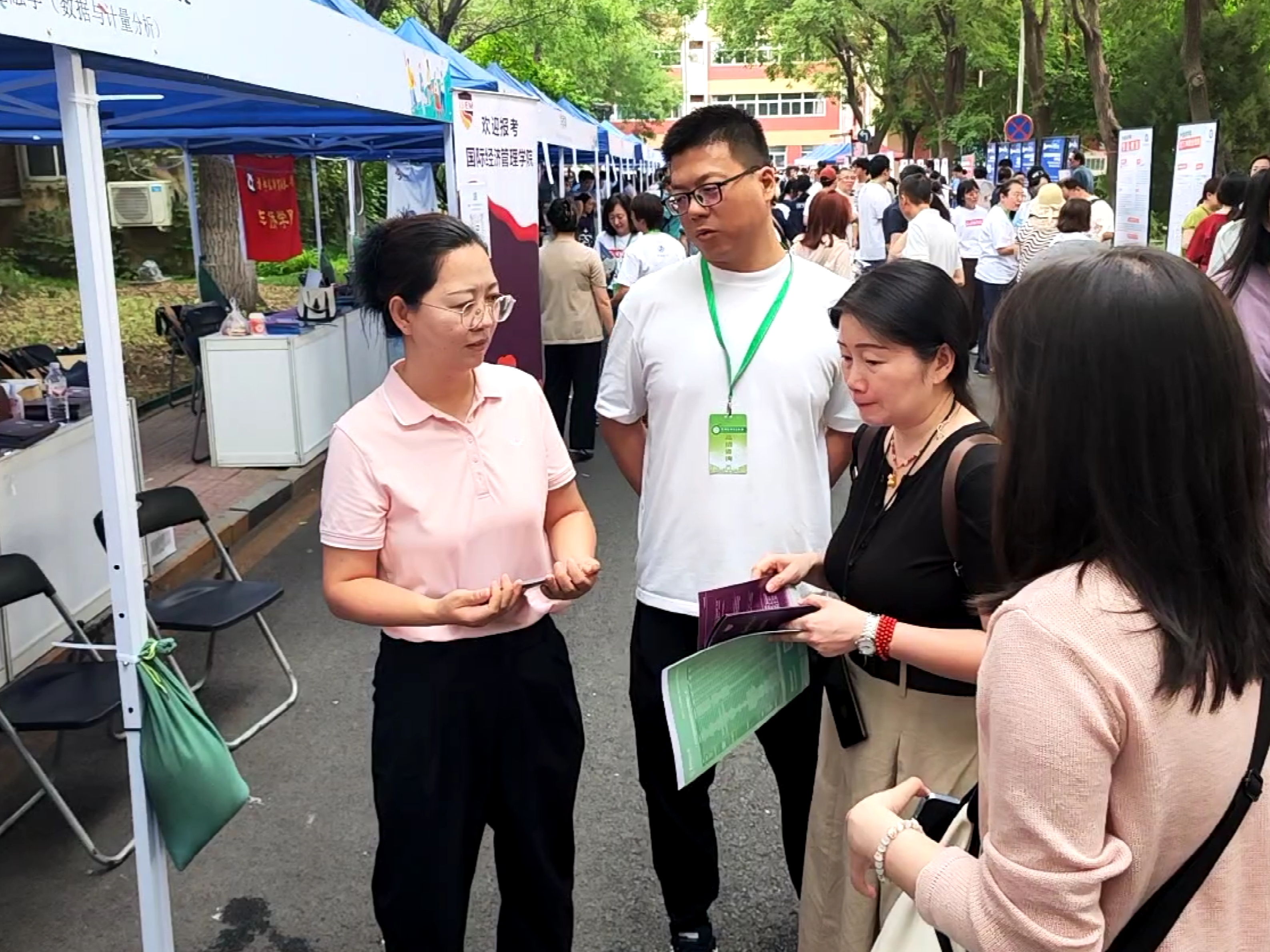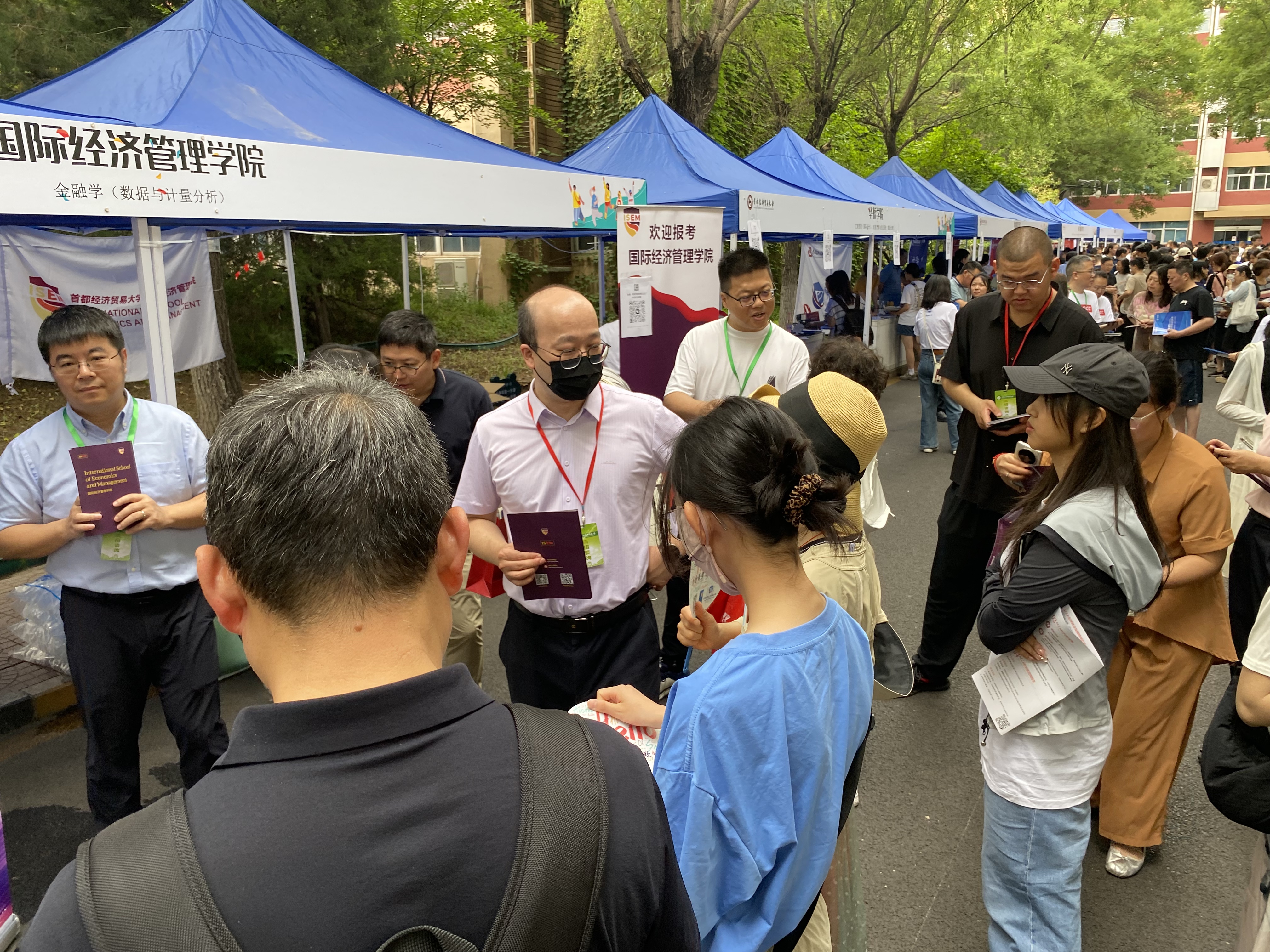 6月26日上午,黄瓜视频 在黄瓜视频 校园开放日活动中,面向2025届高考考生及家长开展了本科招生现场咨询。学院党委书记姜蓓蓓、院长马庆寅、党委副书记付明岩、副院长高静、副院长李委明、金融系两位主任黄宗晔和庞蔡吉、团委书记张雅淇、教学秘书胡一晗以及在校学生代表共同参与了此次活动。