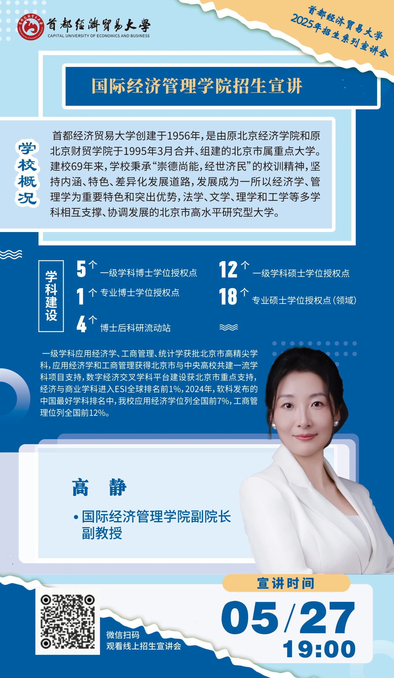 此外,学院积极响应学校教务处2025年招生宣传工作部署,通过线上线下相结合的方式开展了一系列卓有成效的宣传活动。线上方面,学院精心打造“学院专业早知道”微信视频号专题内容,参加黄瓜视频 2025年线上高招直播宣讲(宣讲回放可扫描文末二维码观看),并推出60秒说专业短视频,以生动直观的方式展示专业特色。线下方面,学院组织专业教师团队先后赴北京中医药大学、北京化工大学、全国财经(商科)类高校在津高招咨询会以及北京市十一学校等地开展现场咨询活动。同时,学院还持续提供多渠道咨询服务,包括高招专属微信群答疑和教学办公室电话咨询,确保考生和家长能够及时获取权威信息。通过这些全方位、立体化的宣传活动,学院系统地介绍了学校和学院的办学优势、金融学专业特色及2025年本科招生政策,为考生志愿填报提供了专业指导。
